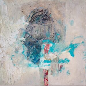 Encaustic collage on board, 12″ x 12″